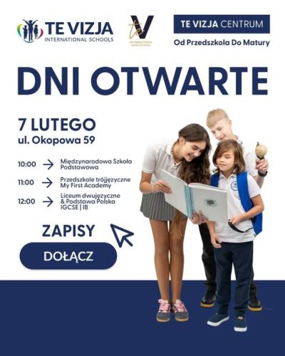 Już w sobotę, 7 lutego, zapraszamy do Warszawy, na ulicę Okopową 59, na dni otwarte Towarzystwa Edukacyjnego VIZJA. To spotkanie dla wszystkich, którzy chcą zobaczyć, jak może wyglądać nowoczesna edukacja oparta na dwujęzyczności – od przedszkola aż po liceum. W TE VIZJA stawiamy nie tylko na wysoki poziom nauczania, ale również na rozwój emocjonalny uczniów, kreatywność i bezpieczne, inspirujące środowisko do nauki. Podczas dni otwartych liceum będzie można poznać oferowane programy edukacyjne, takie jak Cambridge IGCSE, A-Levels, IBDP oraz matura polska. To także okazja, by spotkać naszych nauczycieli, porozmawiać z uczniami, zobaczyć sale lekcyjne i pracownie oraz wziąć udział w warsztatach i spotkaniach. Dni otwarte pozwalają naprawdę poczuć atmosferę szkoły i sprawdzić, czy to miejsce odpowiada Waszym potrzebom i planom na przyszłość. Zapraszamy do TE VIZJA — do zobaczenia! – zaprasza Marzena Godlewska,